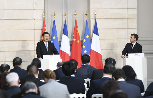 習(xí)近平指出,在務(wù)實合作方面,中法既要深挖市場的“源頭活水”,也要疏浚政策的“河道溝渠”。雙方要深化核能、航空、航天等傳統(tǒng)領(lǐng)域合作,加快科技創(chuàng)新、農(nóng)業(yè)、金融、養(yǎng)老服務(wù)等新興領(lǐng)域合作步伐。我們贊賞總統(tǒng)先生多次表達(dá)同中方開展“一帶一路”務(wù)實合作的意愿,雙方要落實好“一帶一路”第三方市場合作示范項目。要為雙邊貿(mào)易與投資提供更多支持和便利。我們剛剛頒布了《外商投資法》,將繼續(xù)大幅放寬市場準(zhǔn)入,優(yōu)化營商環(huán)境,加強(qiáng)知識產(chǎn)權(quán)保護(hù),打造高水平對外開放新格局。我們歡迎更多法國企業(yè)赴華投資興業(yè),也希望法方為中國企業(yè)在法投資提供公平、開放、非歧視待遇。