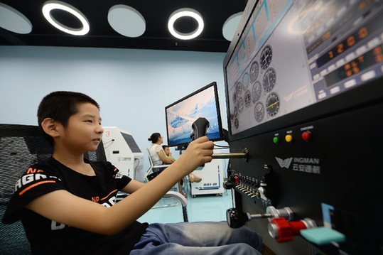 小游客在西安“九號(hào)宇宙”航天科普研學(xué)基地體驗(yàn)飛行器模擬駕駛。記者 李一博 攝