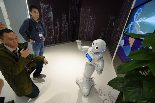 5月26日,參觀者在2019中國國際大數(shù)據(jù)產(chǎn)業(yè)博覽會上與5G+智能機器人進行拍照互動。記者 楊文斌 攝