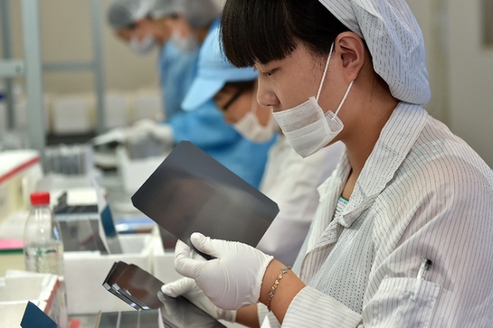 潞安集團(tuán)太陽能科技有限責(zé)任公司的工人在對(duì)硅片外觀進(jìn)行檢測(cè)。記者 曹陽 攝
