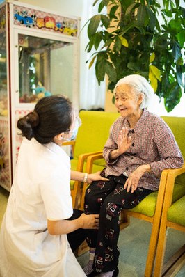 在成都一家養(yǎng)老公寓,醫(yī)護人員在與老人聊天。張可凡 攝
