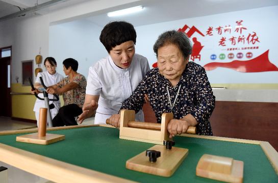 在河北一家康養(yǎng)中心,醫(yī)護人員協(xié)助老人進行康復訓練。記者 朱旭東 攝