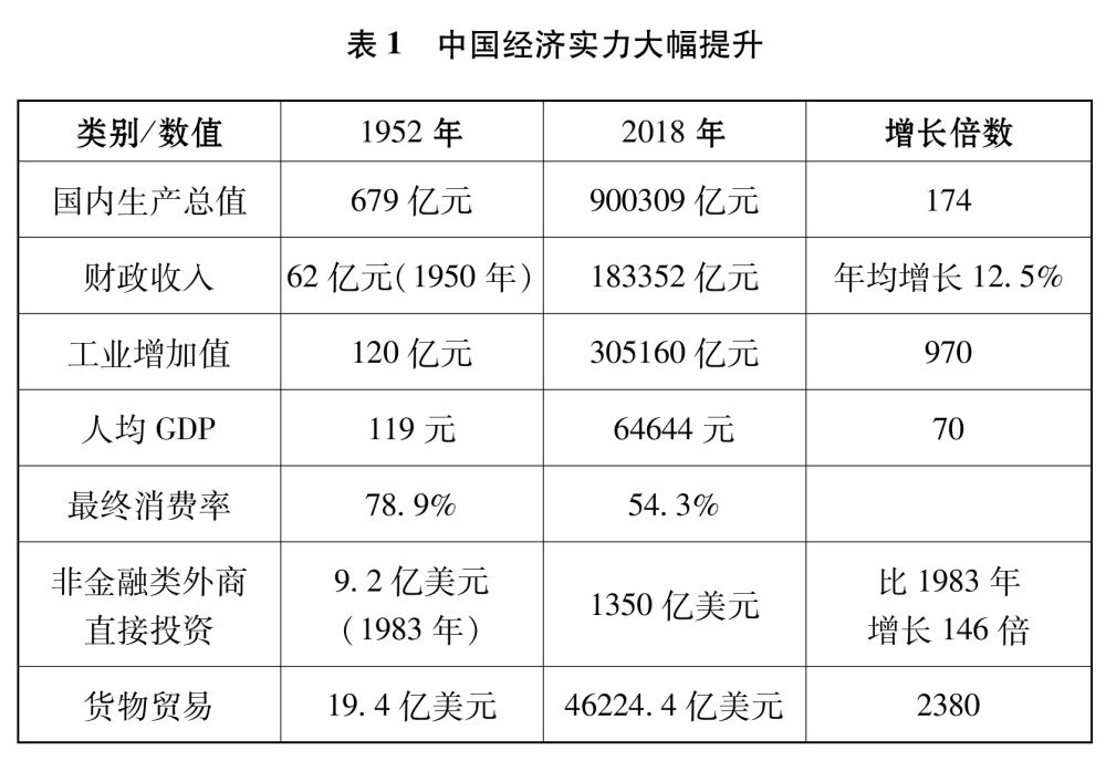 經(jīng)濟(jì)實(shí)力顯著增強(qiáng)。從1952年至2018年,中國(guó)工業(yè)增加值從120億元增加到305160億元,按不變價(jià)格計(jì)算增長(zhǎng)970倍,年均增長(zhǎng)11%;國(guó)內(nèi)生產(chǎn)總值從679億元增加到90萬(wàn)億元,按不變價(jià)計(jì)算增長(zhǎng)174倍,年均增長(zhǎng)8.1%;人均國(guó)內(nèi)生產(chǎn)總值從119元增加到2018年的64644元,按不變價(jià)計(jì)算增長(zhǎng)70倍。根據(jù)世界銀行數(shù)據(jù),按市場(chǎng)匯率計(jì)算,2018年中國(guó)經(jīng)濟(jì)規(guī)模為13.6萬(wàn)億美元,僅次于美國(guó)的20.5萬(wàn)億美元。目前,中國(guó)是世界上唯一擁有聯(lián)合國(guó)產(chǎn)業(yè)分類(lèi)目錄中所有工業(yè)門(mén)類(lèi)的國(guó)家,多項(xiàng)工業(yè)品產(chǎn)量居世界第一??萍及l(fā)展成就顯著,“兩彈一星”、載人航天、超級(jí)雜交水稻、高性能計(jì)算機(jī)、人工合成牛胰島素、青蒿素、高速鐵路等重大科技成果,為經(jīng)濟(jì)社會(huì)發(fā)展提供了有力支撐。對(duì)外貿(mào)易持續(xù)增加,2009年中國(guó)成為全球最大貨物出口國(guó)、第二大貨物進(jìn)口國(guó),2013年成為全球貨物貿(mào)易第一大國(guó)。改革開(kāi)放以來(lái),中國(guó)引進(jìn)外資大幅增加,日益成為吸引全球投資熱土。中國(guó)已經(jīng)成為世界第二大經(jīng)濟(jì)體、制造業(yè)第一大國(guó)、貨物貿(mào)易第一大國(guó)、商品消費(fèi)第二大國(guó)、外資流入第二大國(guó)、外匯儲(chǔ)備第一大國(guó)(表1)。