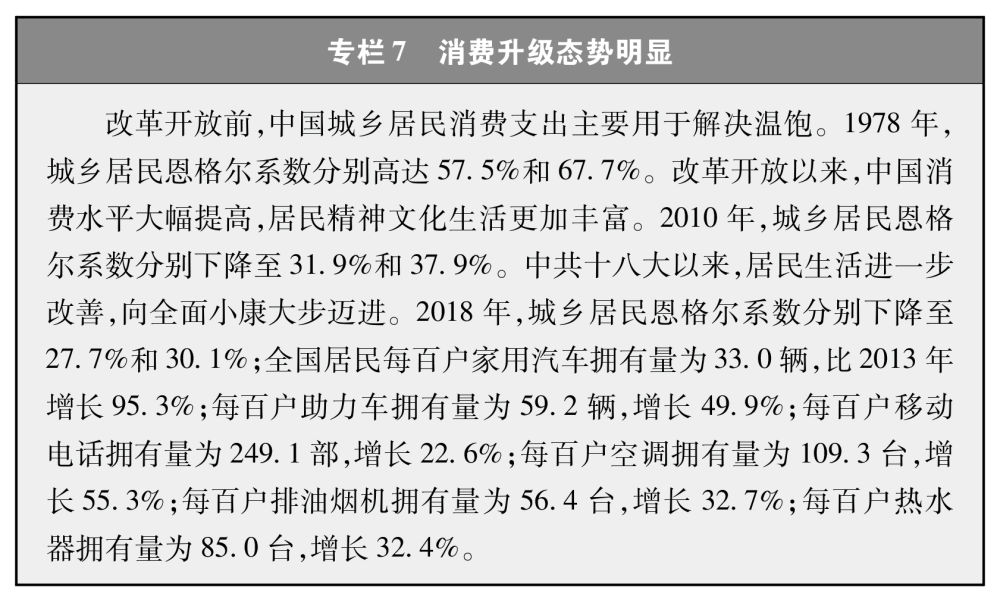 中國(guó)有世界上最具潛力的消費(fèi)市場(chǎng)。中國(guó)既是“世界工廠”,也是“全球市場(chǎng)”。中國(guó)有近14億人口、4億中等收入群體,市場(chǎng)規(guī)模全球最大。中國(guó)經(jīng)濟(jì)持續(xù)健康發(fā)展,帶來(lái)多個(gè)領(lǐng)域的廣泛需求,為經(jīng)濟(jì)發(fā)展提供重要引擎。中國(guó)消費(fèi)空間和潛力巨大,消費(fèi)升級(jí)態(tài)勢(shì)明顯,消費(fèi)增速超過(guò)固定資產(chǎn)投資,消費(fèi)梯度效應(yīng)凸顯,消費(fèi)對(duì)經(jīng)濟(jì)貢獻(xiàn)越來(lái)越大(專(zhuān)欄7)。麥肯錫全球研究院發(fā)布報(bào)告認(rèn)為,在汽車(chē)、酒類(lèi)、手機(jī)等許多品類(lèi)中,中國(guó)都是全球第一大市場(chǎng),消費(fèi)額約占全球消費(fèi)總額的30%。(注5)龐大的消費(fèi)需求為世界各國(guó)提供了巨大市場(chǎng)。未來(lái)15年,中國(guó)進(jìn)口商品和服務(wù)將分別超過(guò)30萬(wàn)億美元和10萬(wàn)億美元。