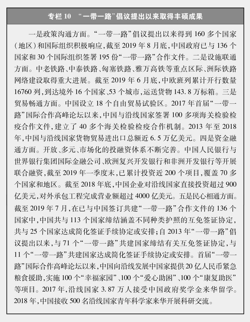 推動(dòng)高質(zhì)量共建“一帶一路”。共建“一帶一路”倡議以共商共建共享為原則,以和平合作、開(kāi)放包容、互學(xué)互鑒、互利共贏的絲綢之路精神為指引,以政策溝通、設(shè)施聯(lián)通、貿(mào)易暢通、資金融通、民心相通為重點(diǎn),已經(jīng)從理念轉(zhuǎn)化為行動(dòng),從愿景轉(zhuǎn)化為現(xiàn)實(shí),從倡議轉(zhuǎn)化為全球廣受歡迎的公共產(chǎn)品(專(zhuān)欄10)。2016年11月聯(lián)合國(guó)通過(guò)決議,歡迎共建“一帶一路”等經(jīng)濟(jì)合作倡議。2017年3月,聯(lián)合國(guó)安理會(huì)決議中呼吁各國(guó)推進(jìn)“一帶一路”建設(shè),構(gòu)建人類(lèi)命運(yùn)共同體?!耙粠б宦贰背h源于中國(guó),機(jī)會(huì)和成果屬于世界。據(jù)世界銀行研究報(bào)告,“一帶一路”倡議將使相關(guān)國(guó)家760萬(wàn)人擺脫極端貧困、3200萬(wàn)擺脫中度貧困,將使參與國(guó)貿(mào)易增長(zhǎng)2.8%至9.7%、全球貿(mào)易增長(zhǎng)1.7%至6.2%、全球收入增加0.7%至2.9%。(注8)“一帶一路”倡議是名副其實(shí)的資源共享、共同繁榮、共同發(fā)展之路。