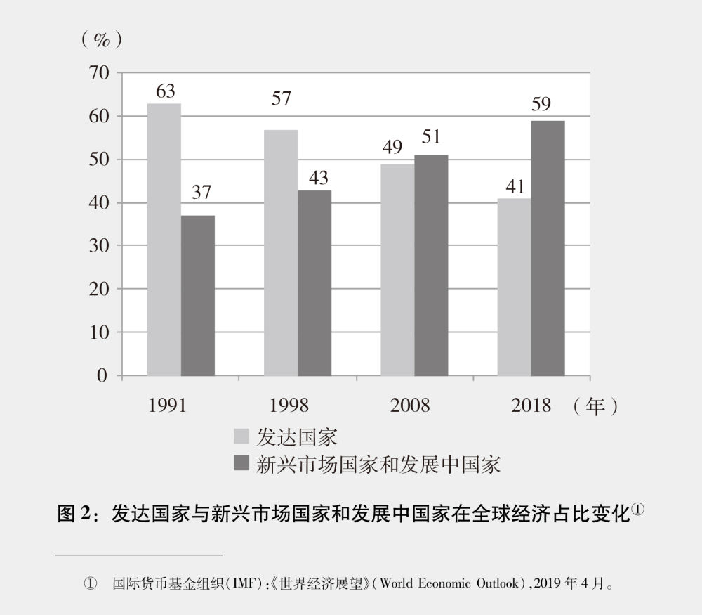 大變局催生新的機(jī)遇。百年未有之大變局的最大變化,就是以中國(guó)為代表的新興市場(chǎng)國(guó)家和發(fā)展中國(guó)家群體性崛起,從根本上改變了國(guó)際力量對(duì)比。工業(yè)革命以來(lái),西方世界在國(guó)際政治經(jīng)濟(jì)格局中長(zhǎng)期占據(jù)主導(dǎo)地位。近幾十年來(lái),新興市場(chǎng)國(guó)家和發(fā)展中國(guó)家緊緊抓住經(jīng)濟(jì)全球化歷史機(jī)遇,實(shí)現(xiàn)了快速發(fā)展。國(guó)際貨幣基金組織最新數(shù)據(jù)顯示,按購(gòu)買(mǎi)力平價(jià)計(jì)算,新興市場(chǎng)國(guó)家和發(fā)展中國(guó)家經(jīng)濟(jì)總量2008年已經(jīng)超過(guò)發(fā)達(dá)國(guó)家,到2018年占世界經(jīng)濟(jì)比重達(dá)到59%(圖2)。當(dāng)今世界,多極化加速發(fā)展,現(xiàn)代化發(fā)展模式更趨多元,國(guó)際治理體系向協(xié)同共治轉(zhuǎn)變,任何國(guó)家或者國(guó)家集團(tuán)都再也無(wú)法單獨(dú)主宰世界事務(wù),求穩(wěn)定、盼和平、謀發(fā)展成為國(guó)際社會(huì)普遍訴求??茖W(xué)技術(shù)是引領(lǐng)大變局的革命性力量?,F(xiàn)在,新一輪科技革命和產(chǎn)業(yè)變革深入發(fā)展,新一代信息技術(shù)廣泛應(yīng)用,大量催生新技術(shù)新產(chǎn)業(yè)新業(yè)態(tài)新模式,人類(lèi)社會(huì)處于生產(chǎn)力大發(fā)展大躍升的前夜。