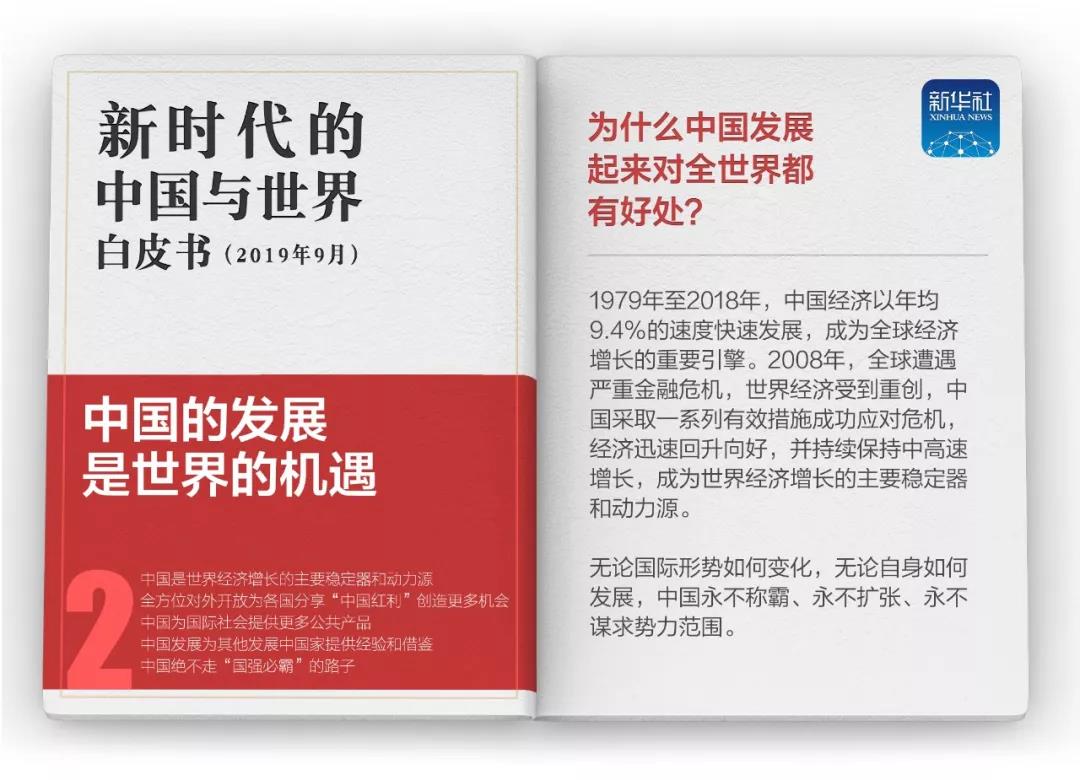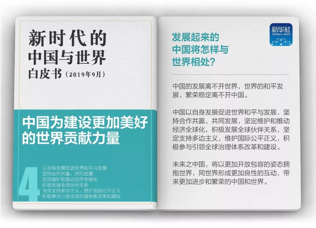 當(dāng)前,中國(guó)發(fā)展進(jìn)入了新時(shí)代。白皮書(shū)指出,新時(shí)代的中國(guó),走中國(guó)特色社會(huì)主義道路的決心不會(huì)改變,與其他國(guó)家互學(xué)互鑒、合作共贏的決心不會(huì)改變,與世界攜手同行的決心不會(huì)改變。未來(lái)之中國(guó),將以更加開(kāi)放包容的姿態(tài)擁抱世界,同世界形成更加良性的互動(dòng),帶來(lái)更加進(jìn)步和繁榮的中國(guó)和世界。