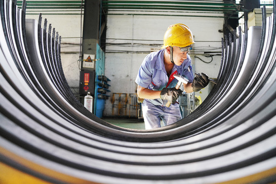 在哈電集團(tuán)哈爾濱汽輪機(jī)廠生產(chǎn)車間,工人在進(jìn)行生產(chǎn)作業(yè)。記者 王建威 攝
