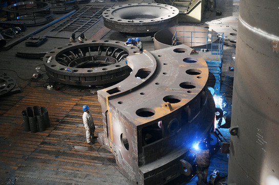 在哈電集團(tuán)哈爾濱電機(jī)廠,工人正在進(jìn)行水輪機(jī)頂蓋的焊接生產(chǎn)。記者 王建威 攝
