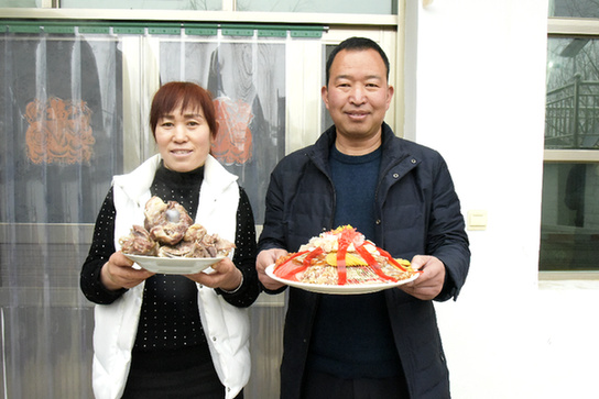 脫貧村里看“年景”。甘肅省定西市岷縣中寨鎮(zhèn)馬崖村村民趙成義(右)和愛人張懷鎖展示過年吃的特色佳肴。記者 王朋 攝
