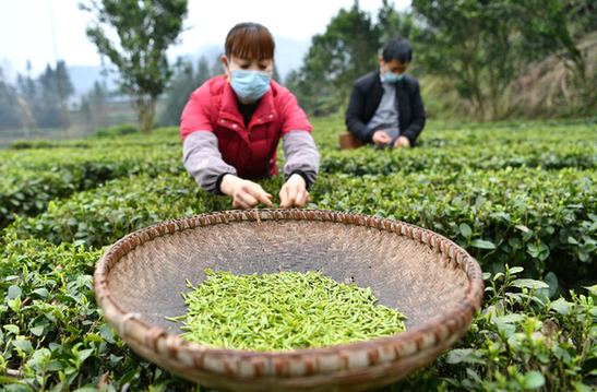 由于冬暖明顯,2月5日起,浙南溫州、麗水等地“烏牛早”春茶已陸續(xù)開(kāi)采,較常年提早大約1周時(shí)間。在麗水市縉云縣胡源鄉(xiāng),8000多畝的茶樹(shù)已萌發(fā)新芽。一大早,茶農(nóng)們就戴上口罩,在茶園里忙碌了起來(lái)?!澳懿烧嗌偈嵌嗌伲巡枨嗉庸こ筛刹枞~放起來(lái),等疫情過(guò)去可以拿到市場(chǎng)上賣?!辈柁r(nóng)胡愛(ài)仙說(shuō)。