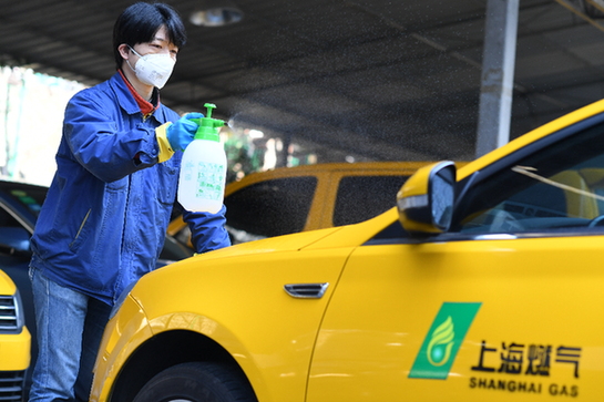 上海燃?xì)鈾z修人員對(duì)待命中的出勤車輛進(jìn)行消毒。(企業(yè)供圖)