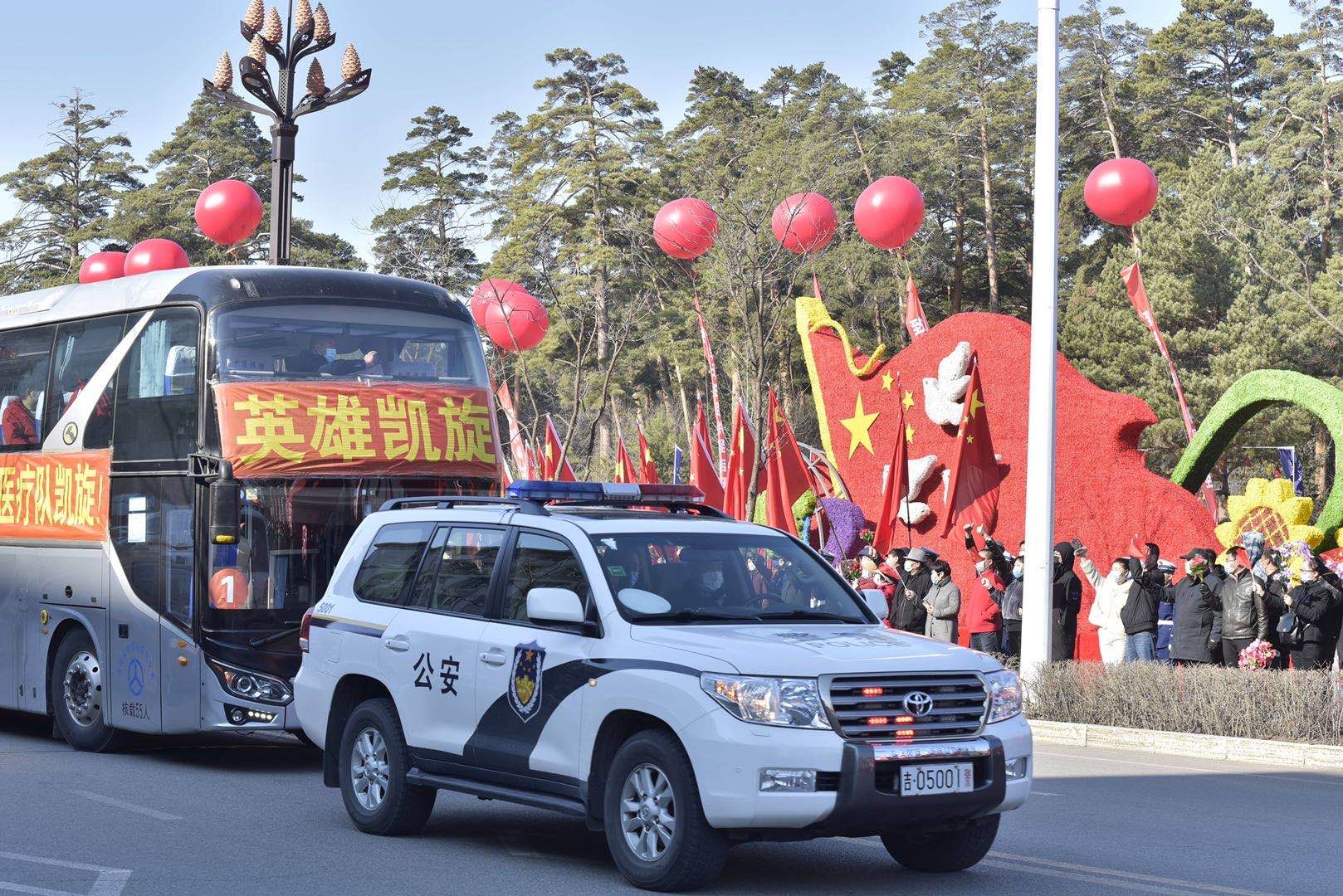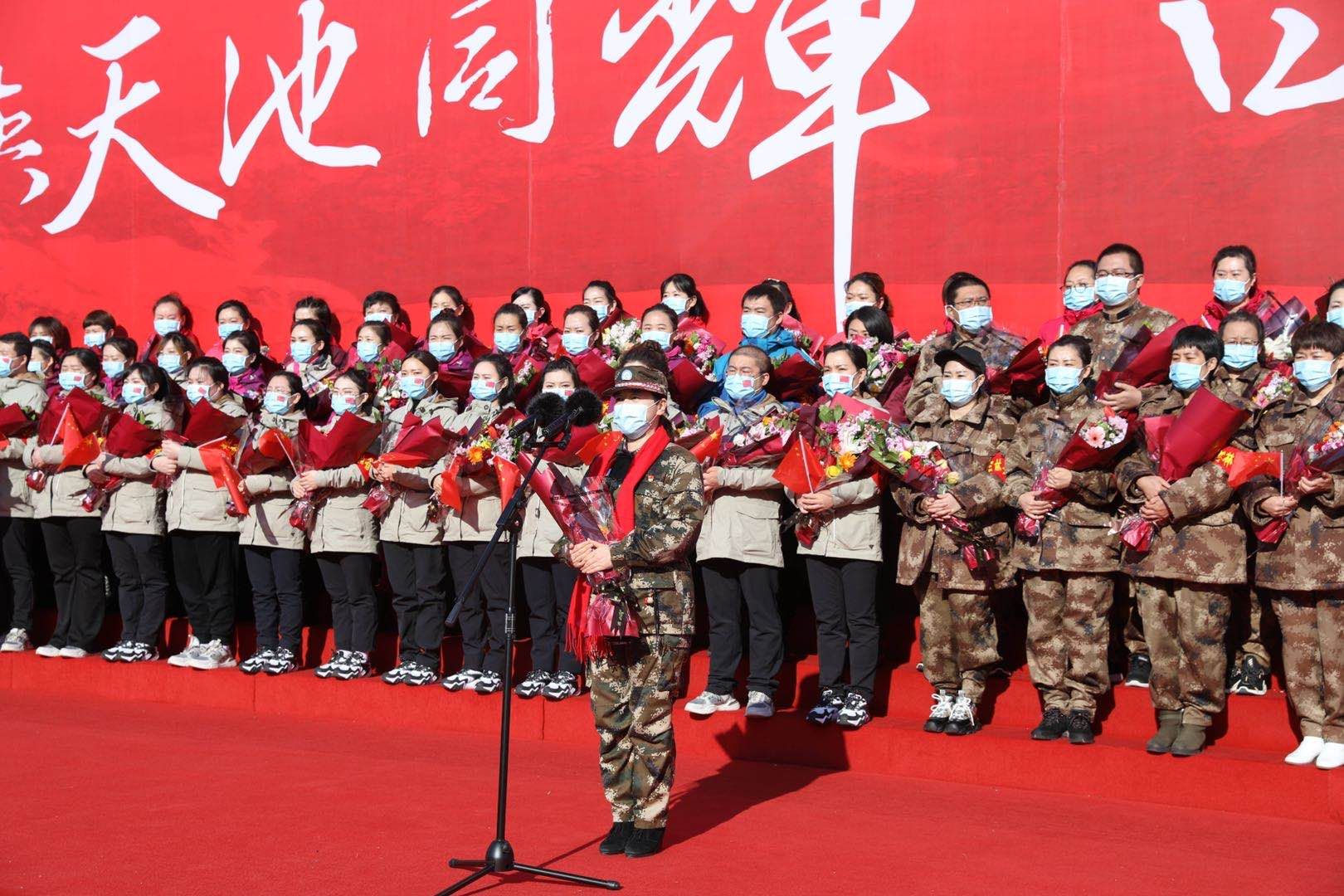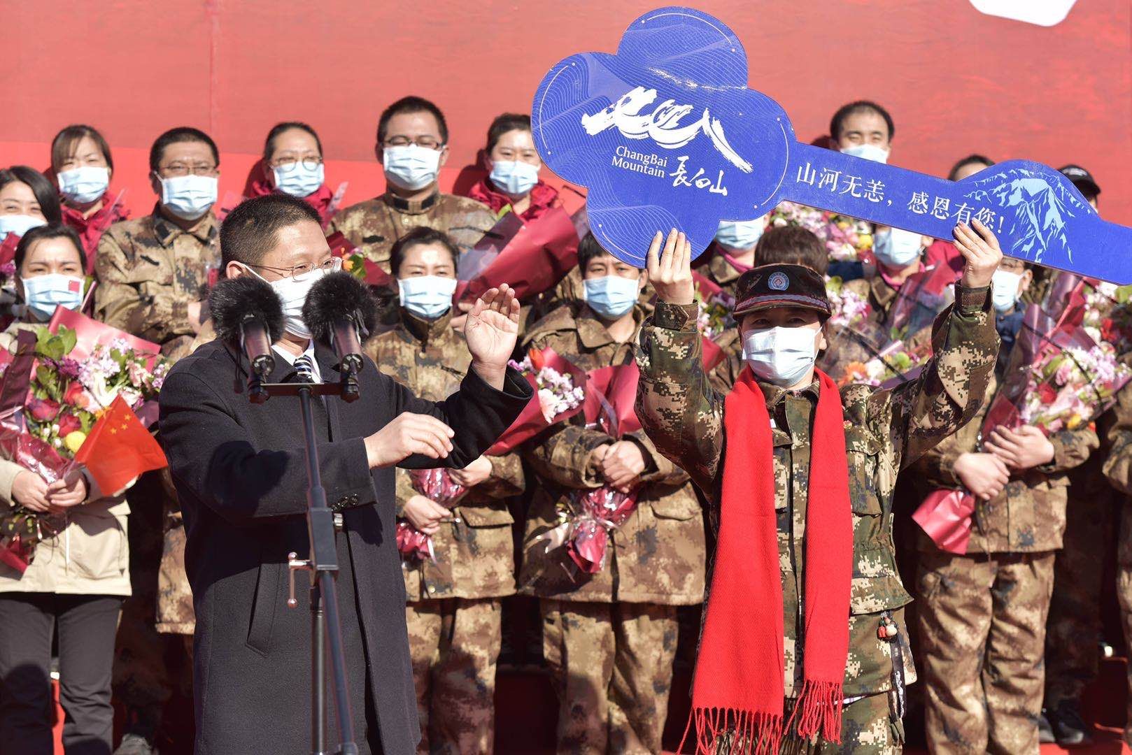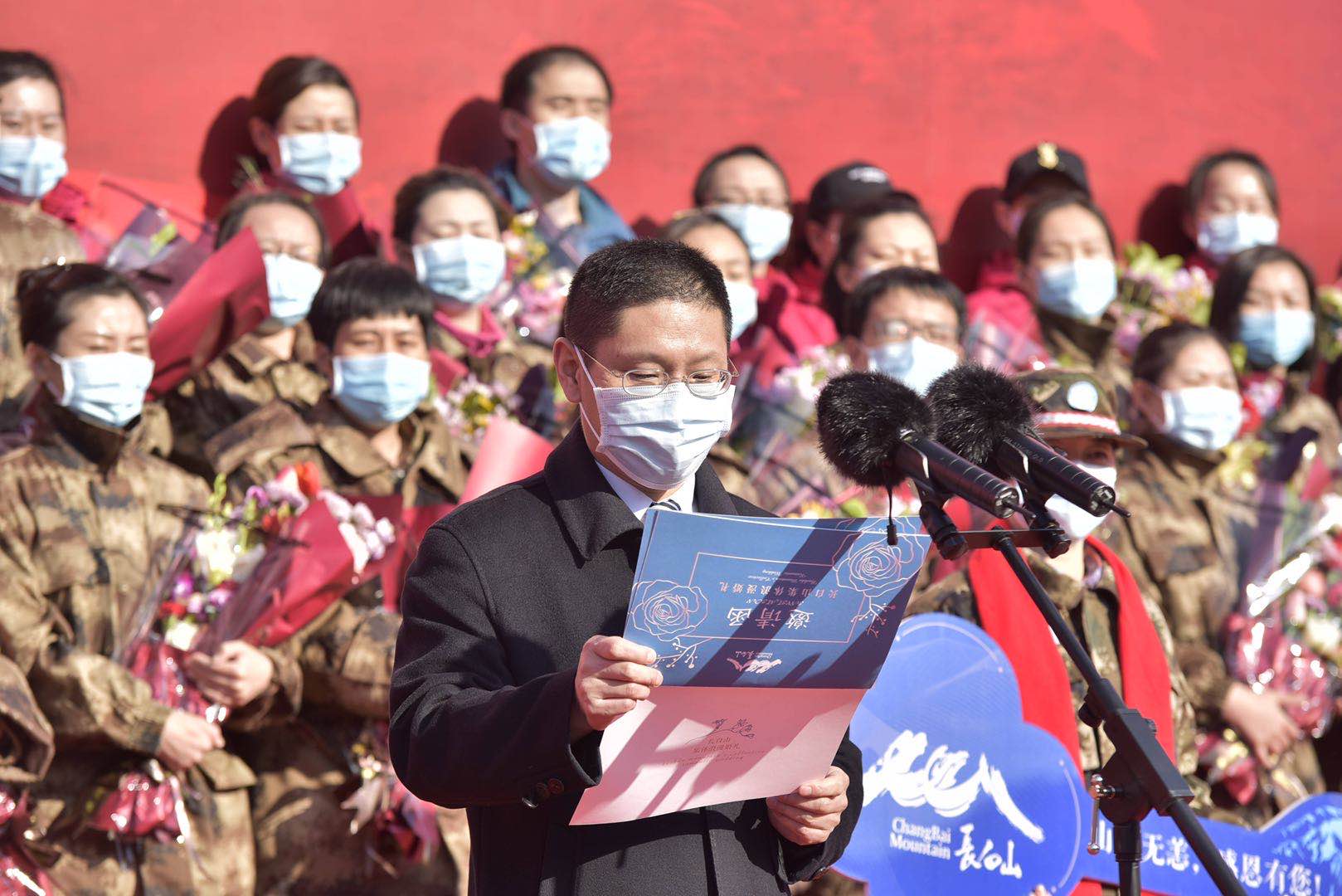 ????長(zhǎng)白山衛(wèi)健局局長(zhǎng)張?jiān)诿鞒謨x式。省衛(wèi)健委副主任楊春光、省衛(wèi)健委王哲、通化市衛(wèi)健委于鳳翔、長(zhǎng)白山管委會(huì)旅游文體局耿德勇、白山市衛(wèi)健委孫學(xué)明、公主嶺市衛(wèi)健局林澤禮、吉林省前衛(wèi)醫(yī)院李海波,以及相關(guān)部門、長(zhǎng)白山池北區(qū)群眾、各地迎接抗疫英雄的車隊(duì)等3000余人參加了歡送儀式。