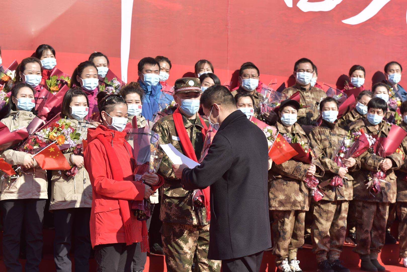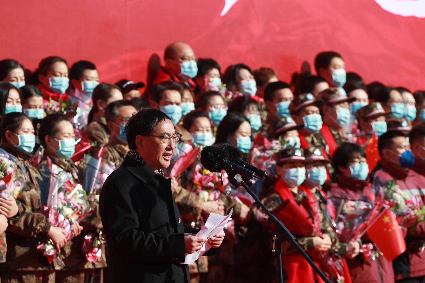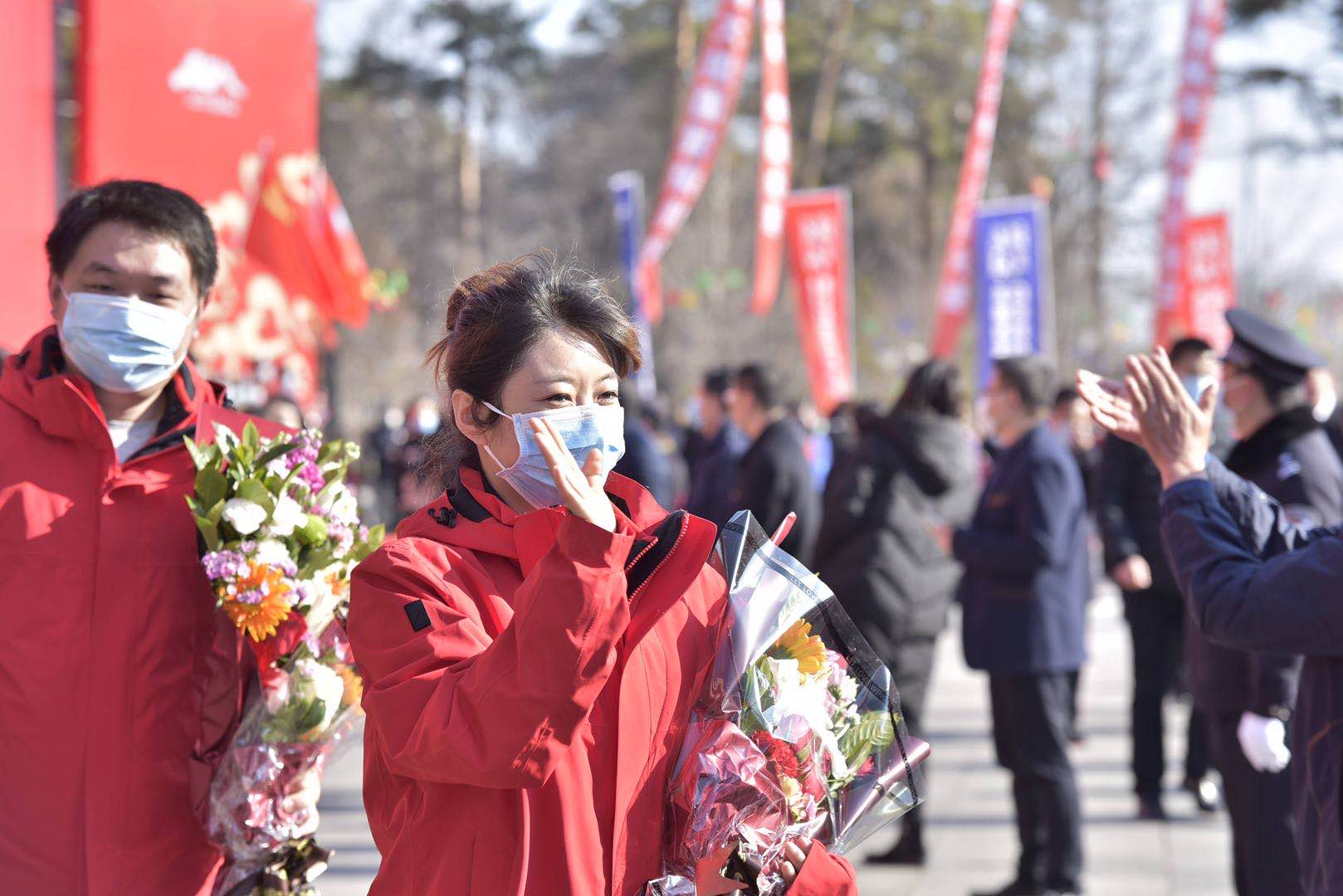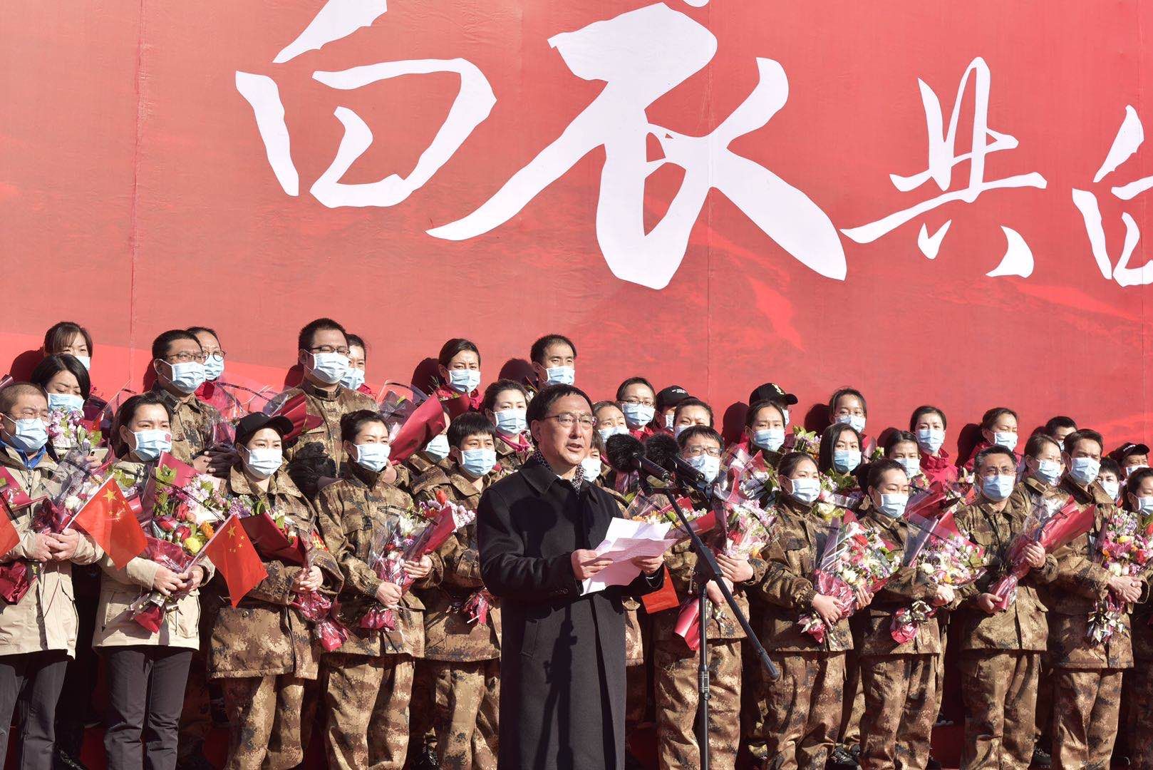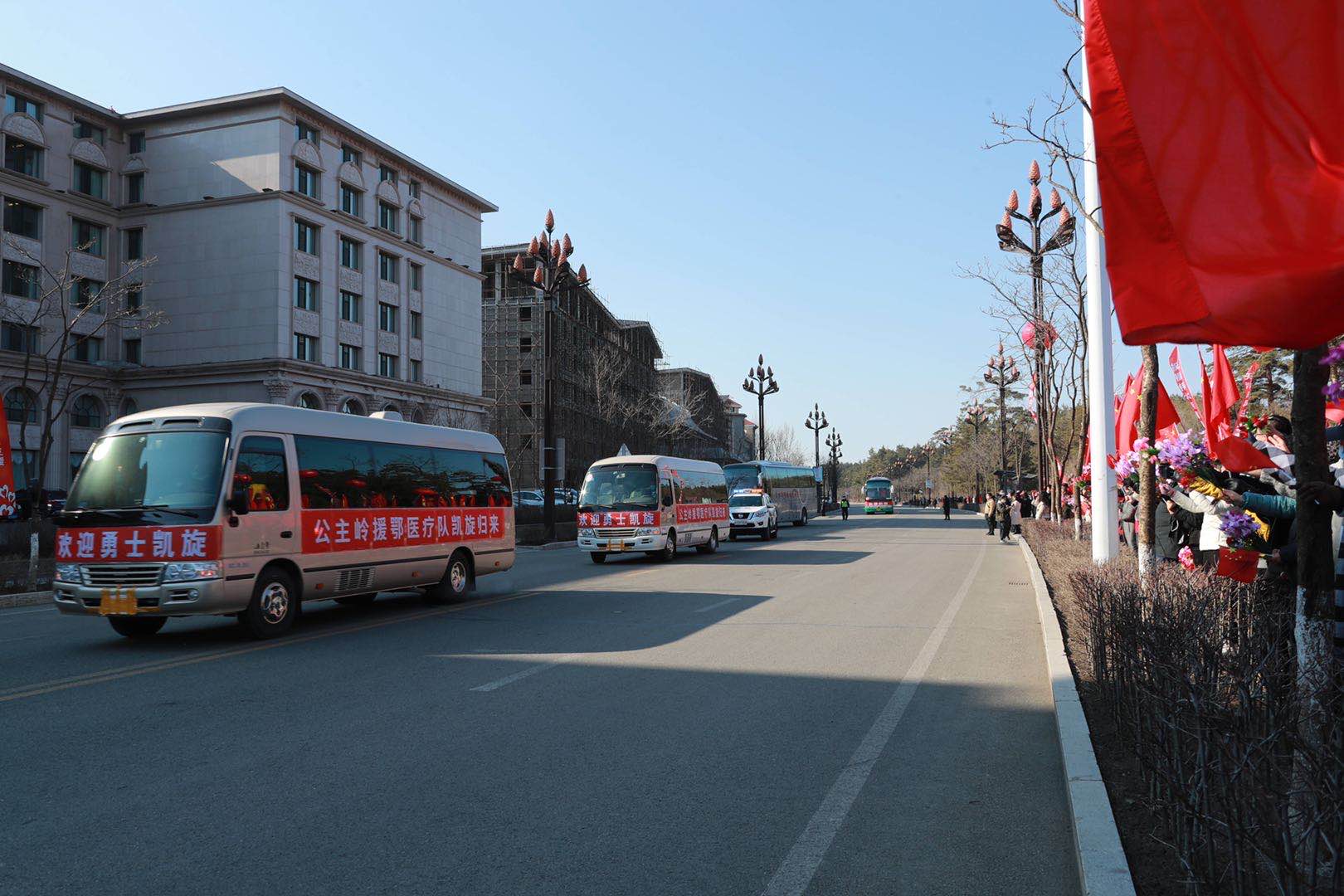 ????長(zhǎng)白山衛(wèi)健局局長(zhǎng)張?jiān)诿鞒謨x式。省衛(wèi)健委副主任楊春光、省衛(wèi)健委王哲、通化市衛(wèi)健委于鳳翔、長(zhǎng)白山管委會(huì)旅游文體局耿德勇、白山市衛(wèi)健委孫學(xué)明、公主嶺市衛(wèi)健局林澤禮、吉林省前衛(wèi)醫(yī)院李海波,以及相關(guān)部門、長(zhǎng)白山池北區(qū)群眾、各地迎接抗疫英雄的車隊(duì)等3000余人參加了歡送儀式。