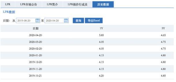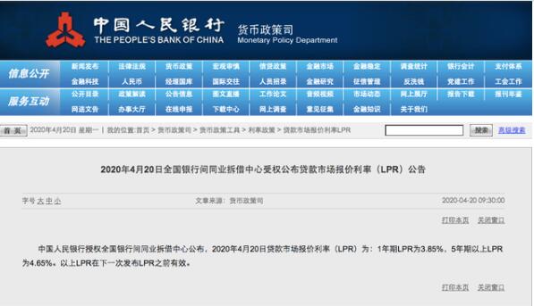 根據(jù)央行官網(wǎng)9時30分發(fā)布的最新消息,中國人民銀行授權(quán)全國銀行間同業(yè)拆借中心公布,2020年4月20日貸款市場報價利率(LPR)為:1年期LPR為3.85%,5年期以上LPR為4.65%。以上LPR在下一次發(fā)布LPR之前有效。