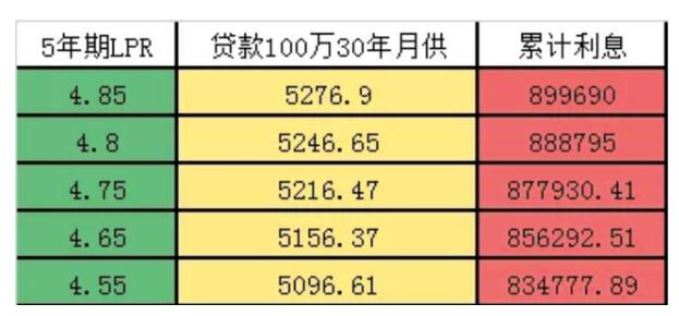 以100萬元房貸、等額本息償還30年計算,5年期以上LPR每下降10個基點,月供額約減少60元。4月5年期以上LPR降低10個基點至4.65%,月供將從5216.47元減少至5156.37元,累計利息相差了2.16萬元。