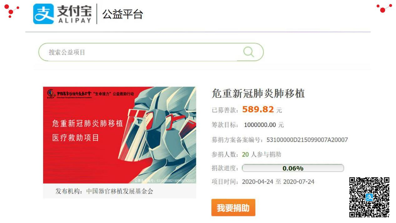 ????該項(xiàng)目擬使用自有資金啟動項(xiàng)目推進(jìn)的同時(shí)開展公募籌集醫(yī)療救助金,可在支付寶公益平臺查詢。