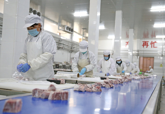 工人在寧夏鹽池灘羊產(chǎn)業(yè)發(fā)展集團(tuán)生產(chǎn)車間內(nèi)加工灘羊肉。記者 賈浩成 攝