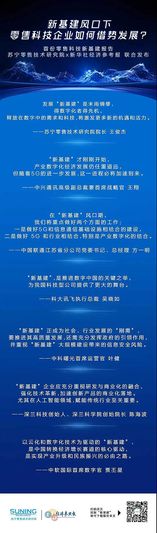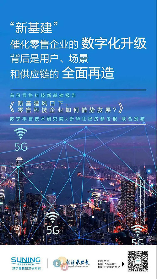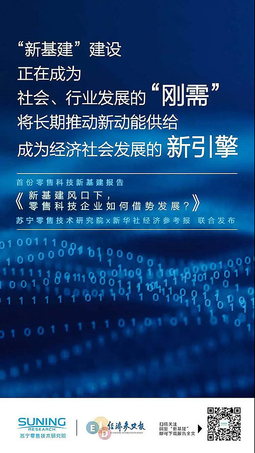 伴隨著今年政府工作報(bào)告正式將“新基建”作為推動(dòng)我國(guó)經(jīng)濟(jì)高質(zhì)量發(fā)展的新動(dòng)能,并對(duì)其任務(wù)目標(biāo)明確部署,行業(yè)領(lǐng)路者們也踏上了助力新時(shí)代新發(fā)展的全新賽道。作為中國(guó)領(lǐng)先的智慧零售服務(wù)商,蘇寧已在“新基建”方面展開(kāi)全場(chǎng)景布局實(shí)踐,蘇寧零售技術(shù)研究院和新華社經(jīng)濟(jì)參考報(bào)近日更是聯(lián)合發(fā)布首份零售科技行業(yè)的“新基建”深度調(diào)研報(bào)告。