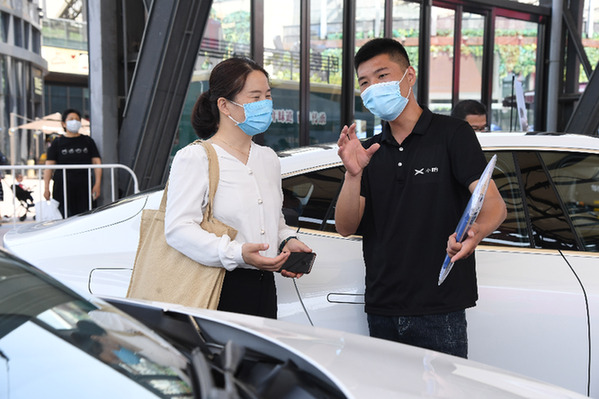6月6日,在北京華熙LIVE·五棵松商業(yè)街區(qū)舉辦的“北京消費季之悅動海淀”活動現(xiàn)場,工作人員(右)向市民介紹一款汽車的配置。當日,北京消費季正式開啟,進一步推動北京各行業(yè)復商復市,加快實現(xiàn)消費回暖。