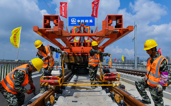中鐵四局施工人員正在進(jìn)行高鐵長軌鋪設(shè)作業(yè)。中鐵四局供圖