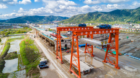 中鐵四局承建的杭(州)紹(興)臺(tái)(州)鐵路正在進(jìn)行提梁架設(shè)作業(yè)。中鐵四局供圖