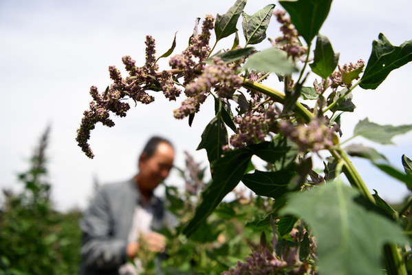 8月2日,天祝藏族自治縣松山鎮(zhèn)大溝興農(nóng)種養(yǎng)殖專業(yè)合作社負(fù)責(zé)人文玉廷在地里查看藜麥生長(zhǎng)情況。記者 陳斌 攝