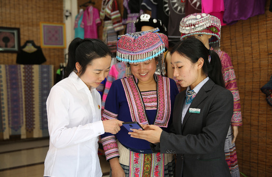 農(nóng)行云南屏邊縣支行有效支持“苗繡”發(fā)展,農(nóng)行職工為合作社負責人安裝掌上銀行。梁志強 攝