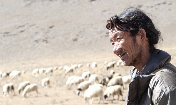 夕陽(yáng)西下,邊巴迎著喜馬拉雅北麓入秋的疾風(fēng),一邊打?yàn)鯛柖洌ú卣Z(yǔ),牧人趕牛羊的投石工具),一邊大聲吆喝著趕羊群回圈。盡管長(zhǎng)年風(fēng)吹日曬在他臉上留下一道道“溝壑”,在海拔4400米的草場(chǎng),心情歡快的邊巴仍健步如飛。