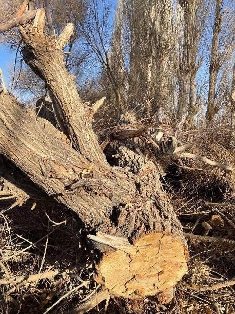 當(dāng)?shù)刂槿耸肯蛴浾咧鹨恢刚J(rèn),幸存下來的樹木分布于林場(chǎng)西側(cè)和西南角兩塊面積不大的林地,以及林場(chǎng)主干次道兩側(cè)的行道樹、一些地塊的間隔樹。兩位曾在陽關(guān)林場(chǎng)工作20多年的職工對(duì)記者說,曾親眼看見被成片砍掉的新疆楊、檉柳、胡楊等樹種,老化枯死的“老年樹”和病死樹只占極少部分,大片正值青壯年的樹木像遇到推剪一樣,一棵不留地被推倒,上萬畝林子被“剃光頭”。