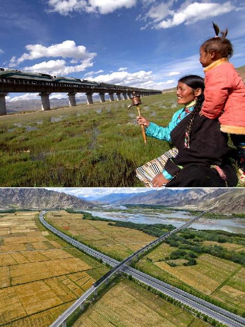 上圖為西藏當(dāng)雄縣藏族群眾在觀看火車(chē)駛過(guò)(2006年6月17日記者覺(jué)果攝);下圖為在西藏拉薩市曲水縣拍攝的公路與鐵路(2016年8月17日記者普布扎西攝 無(wú)人機(jī)照片),西藏已形成了公路、鐵路、航空的立體交通網(wǎng)絡(luò)。新華社發(fā)