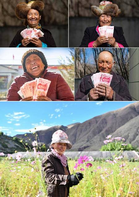 上四圖為2021年2月9日,山南市乃東區(qū)克松社區(qū)領(lǐng)到分紅的農(nóng)民興高采烈(記者普布扎西攝);下圖為西藏昌都市察雅縣卡貢村村民在當(dāng)?shù)孛缙援a(chǎn)業(yè)基地采集鮮花種子,曾經(jīng)的建檔立卡貧困戶在這里實(shí)現(xiàn)了就業(yè),完成了脫貧(2020年9月28日 記者晉美多吉攝)。新華社發(fā)