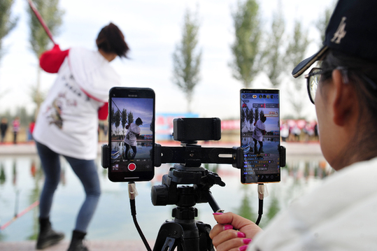 在肅寧縣舉行的一場釣魚比賽中,主播利用直播平臺(tái)現(xiàn)場直播,向網(wǎng)友推介肅寧魚竿。新華社發(fā)(苑立偉 攝)