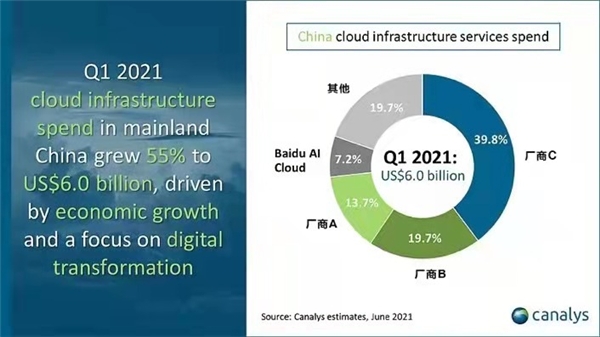 Canalys報告顯示,在2021年第一季度,中國云計算市場規(guī)模達到60億美元,同比增長55%,占全球14%,是僅次于美國的全球第二大云計算市場。其中,百度智能云等四家云服務廠商合計市場份額超過80%。