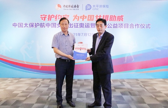 7月12日,中國太保向國家體育總局排球運(yùn)動(dòng)管理中心遞送中國女排專屬定制保單。(中國太保供圖)