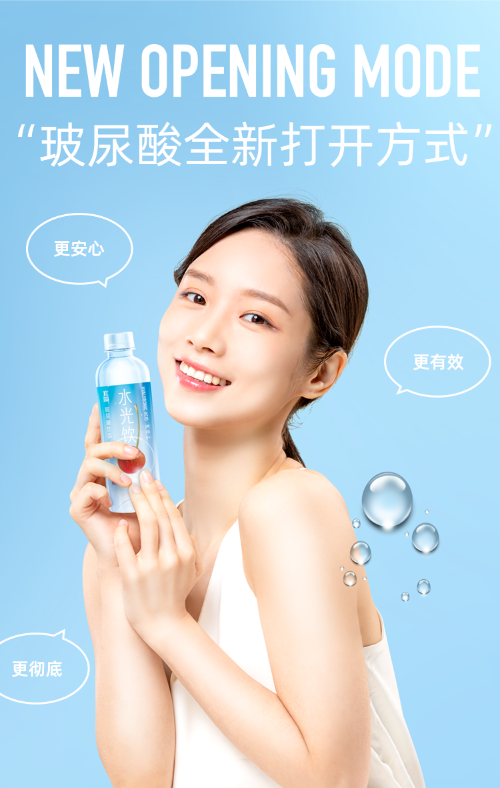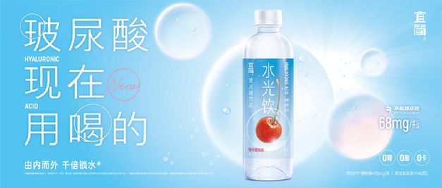 此次宜簡推出的水光飲玻尿酸飲品,每瓶含玻尿酸成分68mg。相較市面上含有玻尿酸成分的產(chǎn)品,一片玻尿酸面膜的含量約為5-15mg,一支玻尿酸針劑的含量約20mg,宜簡水光飲一瓶68mg的添加量無疑是具備市場(chǎng)競(jìng)爭(zhēng)力的。據(jù)悉,該核心成分源自玻尿酸龍頭企業(yè)--華熙生物的專利原料。據(jù)華熙生物研究,玻尿酸具有良好的保濕性和增強(qiáng)皮膚組織彈性功能,1g玻尿酸可結(jié)合1kg水分,持續(xù)性的補(bǔ)充可以清除體內(nèi)自由基從而延緩組織衰老。簡而言之,就是增加皮膚水分、抗氧化和抗衰老。