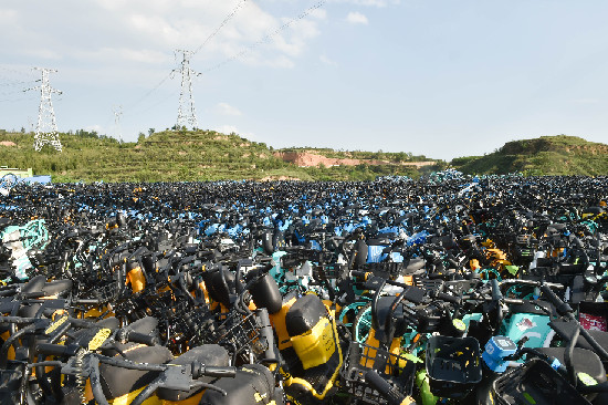 這是位于山西省太原市楊家峪村附近的一處共享電單車回收倉庫(8月4日攝)。