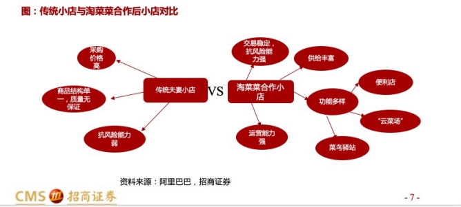 ????招商證券指出,在前端,淘菜菜推動夫妻小店現(xiàn)代化,使其成為功能多元的社區(qū)綜合服務(wù)店。淘菜菜提供三方面升級:“云菜場”,支持小店的生鮮生意;?“一店多能”,支持云菜場、便利店、收發(fā)快遞、外賣配送等多種模塊;“品牌店”,扶持一批夫妻小店品牌升級。據(jù)阿里披露,最近半年接入淘菜菜的小店綜合收入提升了30%。