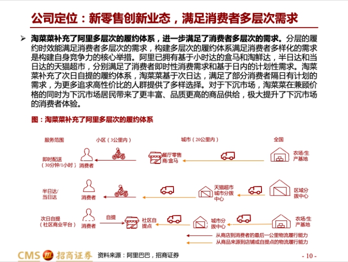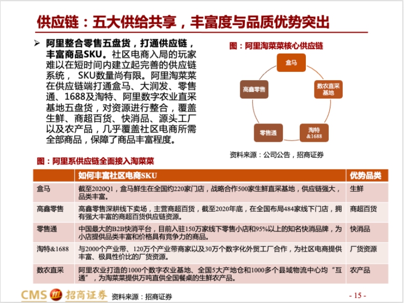 ????招商證券認(rèn)為,淘菜菜對商品質(zhì)量要求更為嚴(yán)格,商品品質(zhì)優(yōu)于競對。農(nóng)產(chǎn)品和生鮮具有非標(biāo)、易損等特點,供應(yīng)鏈相對復(fù)雜。淘菜菜從供應(yīng)鏈源頭把控產(chǎn)品品質(zhì),為1671款生鮮制定了16道品質(zhì)管控流程。在履約端,目前淘菜菜三溫層倉運冷鏈覆蓋率達(dá)到100%,中午12點送達(dá)率超過99%,均為行業(yè)領(lǐng)先。此外,淘菜菜還獲得菜鳥支持。后者網(wǎng)絡(luò)體系龐大,覆蓋全國2700多個區(qū)縣,能夠與淘菜菜形成良好的協(xié)同效應(yīng)。