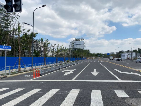 由于目前還未通車(chē),記者從吳美路合川路走到了吳美路虹許路,分為三段,分別是合川路-萬(wàn)源路、萬(wàn)源路-蓮花路、蓮花路-虹許路,只見(jiàn)嶄新的瀝青路面上,各種交通標(biāo)線已經(jīng)劃好,路燈和交通標(biāo)識(shí)牌均已安裝完成;道路兩旁,兩排整齊的綠化樹(shù)苗長(zhǎng)勢(shì)良好。在道路連接萬(wàn)源路、蓮花路部分,仍用圍擋圍住。記者走完全程,大概花了半小時(shí),路況很好,非常便捷。