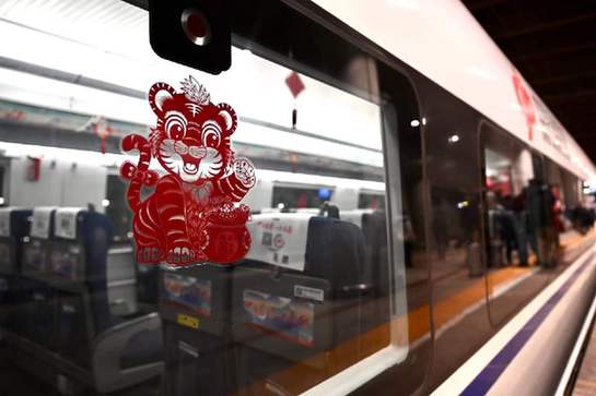 車(chē)窗上貼著姿態(tài)各異的小老虎窗花,行李架下方掛著大紅的福字,走進(jìn)G6737次列車(chē)的5號(hào)車(chē)廂,濃濃的年味撲面而來(lái)。