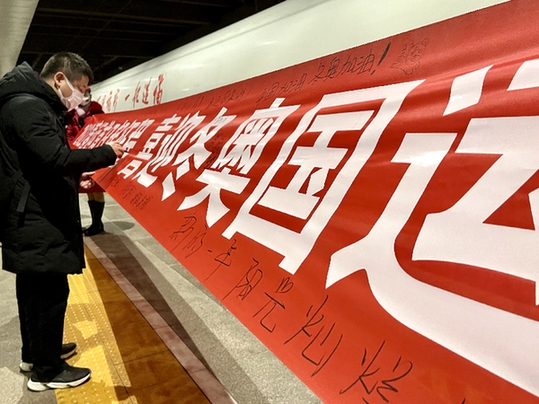 不少旅客拿起筆在寫(xiě)有“2022春運(yùn)首日起征程 喜迎冬奧國(guó)運(yùn)興” 的條幅上寫(xiě)下他們對(duì)新年的祝福?!翱挂弑貏佟薄靶碌囊荒觋?yáng)光燦爛”“中國(guó)加油!冬奧加油!”“2022家人平安”……