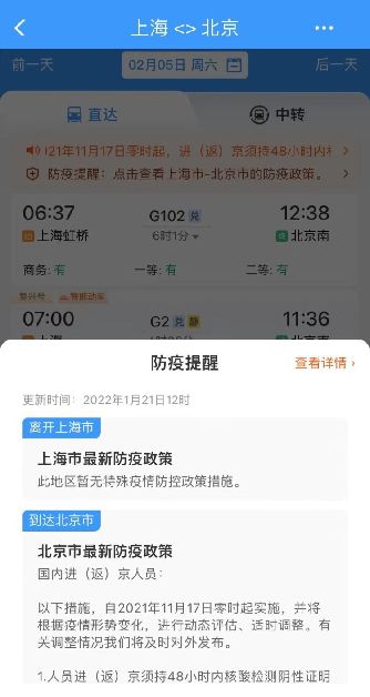各地防疫新政可在鐵路12306APP上進行查詢。例如,查詢上海到北京的列車,在購票頁面的最上端點開兩地的“防疫提醒”。
