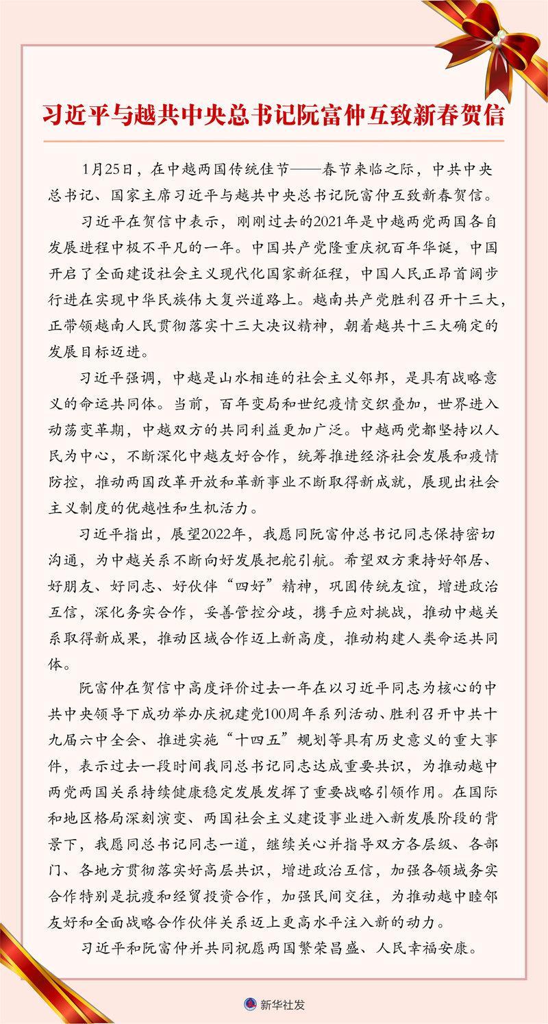 習(xí)近平在賀信中表示,剛剛過去的2021年是中越兩黨兩國各自發(fā)展進程中極不平凡的一年。中國共產(chǎn)黨隆重慶祝百年華誕,中國開啟了全面建設(shè)社會主義現(xiàn)代化國家新征程,中國人民正昂首闊步行進在實現(xiàn)中華民族偉大復(fù)興道路上。越南共產(chǎn)黨勝利召開十三大,正帶領(lǐng)越南人民貫徹落實十三大決議精神,朝著越共十三大確定的發(fā)展目標邁進。