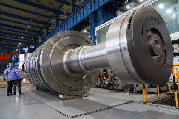 2021年7月1日,中國一重集團有限公司軋電制造廠生產(chǎn)車間,工人在對企業(yè)自主制造的百萬千瓦整鍛低壓轉(zhuǎn)子進行檢測作業(yè)。新華社記者 王建威 攝