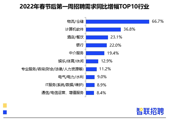 2月14日,智聯(lián)招聘發(fā)布了最新一期2022年春招市場行情周報(bào)。2022年春節(jié)后第一周,隨著企業(yè)復(fù)工復(fù)產(chǎn)和人員流動(dòng),就業(yè)市場供需雙方的活躍度開始上升。節(jié)后第二周,各地高校開學(xué)季逐漸拉開帷幕,企業(yè)招聘和畢業(yè)生求職將迎來小高潮。