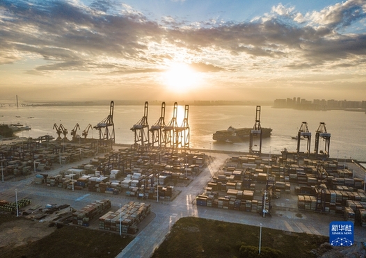 這是2021年12月5日清晨在海南洋浦經(jīng)濟開發(fā)區(qū)拍攝的海南自貿(mào)港建設(shè)重要的集裝箱航運樞紐——洋浦國際集裝箱碼頭(無人機照片)。新華社記者 蒲曉旭 攝