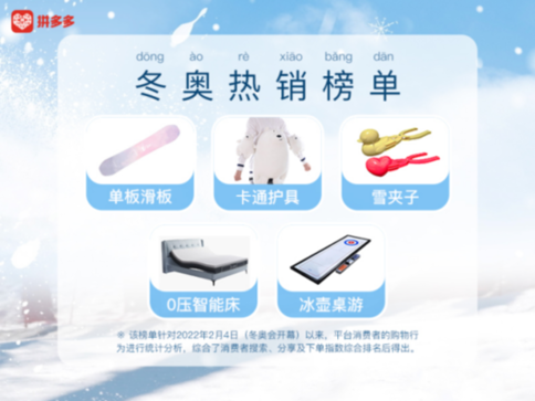 近日,冬奧盛會(huì)引發(fā)全民關(guān)注,滑雪等運(yùn)動(dòng)的關(guān)注度顯著增加,激發(fā)了人們對(duì)于冰雪運(yùn)動(dòng)的參與熱情。健兒們?cè)谫悎?chǎng)上拼搏,網(wǎng)友則在網(wǎng)上拼購(gòu)起了滑雪裝備。2月16日,新電商平臺(tái)拼多多發(fā)布冬奧熱銷(xiāo)榜單,自北京冬奧會(huì)開(kāi)幕以來(lái),單板滑雪板、滑雪護(hù)具、0壓智能床、冰壺桌游等商品銷(xiāo)量漲幅明顯。同時(shí)冬奧“頂流”IP效應(yīng)明顯,谷愛(ài)凌同款、冰墩墩成為熱門(mén)搜索詞。