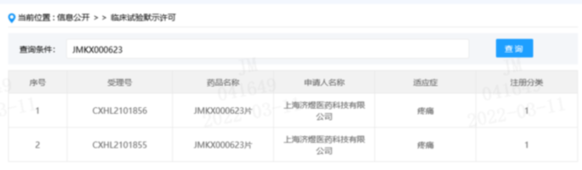 JMKX000623是上海濟(jì)煜自主研發(fā)的高選擇性離子通道阻滯劑,擁有自主知識(shí)產(chǎn)權(quán),屬化學(xué)藥品1類,臨床試驗(yàn)申請(qǐng)于2021年12月30日獲得CDE受理,僅2個(gè)月零10天即獲得臨床試驗(yàn)?zāi)驹S可。JMKX000623通過阻滯鈉離子內(nèi)流而阻止痛覺發(fā)生和傳遞,有望為各種疼痛患者提供治療上的有效緩解。
