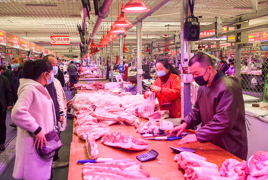在農(nóng)貿(mào)批發(fā)市場(chǎng),市民在采購(gòu)豬肉。(資料照片)新華社記者 彭源 攝